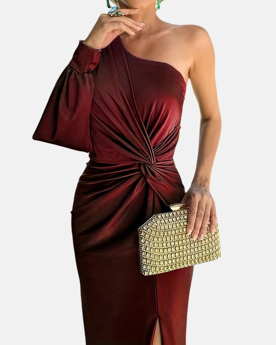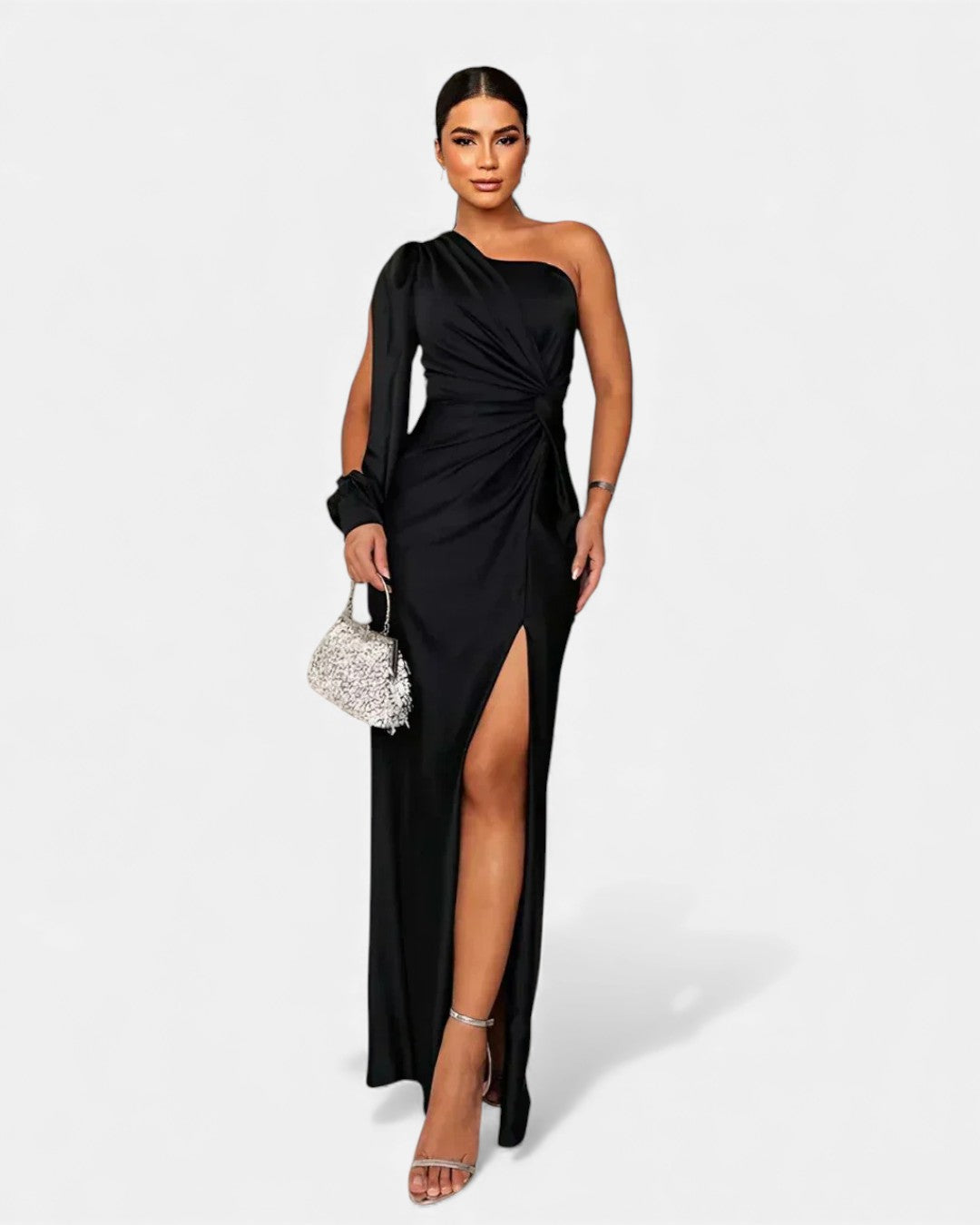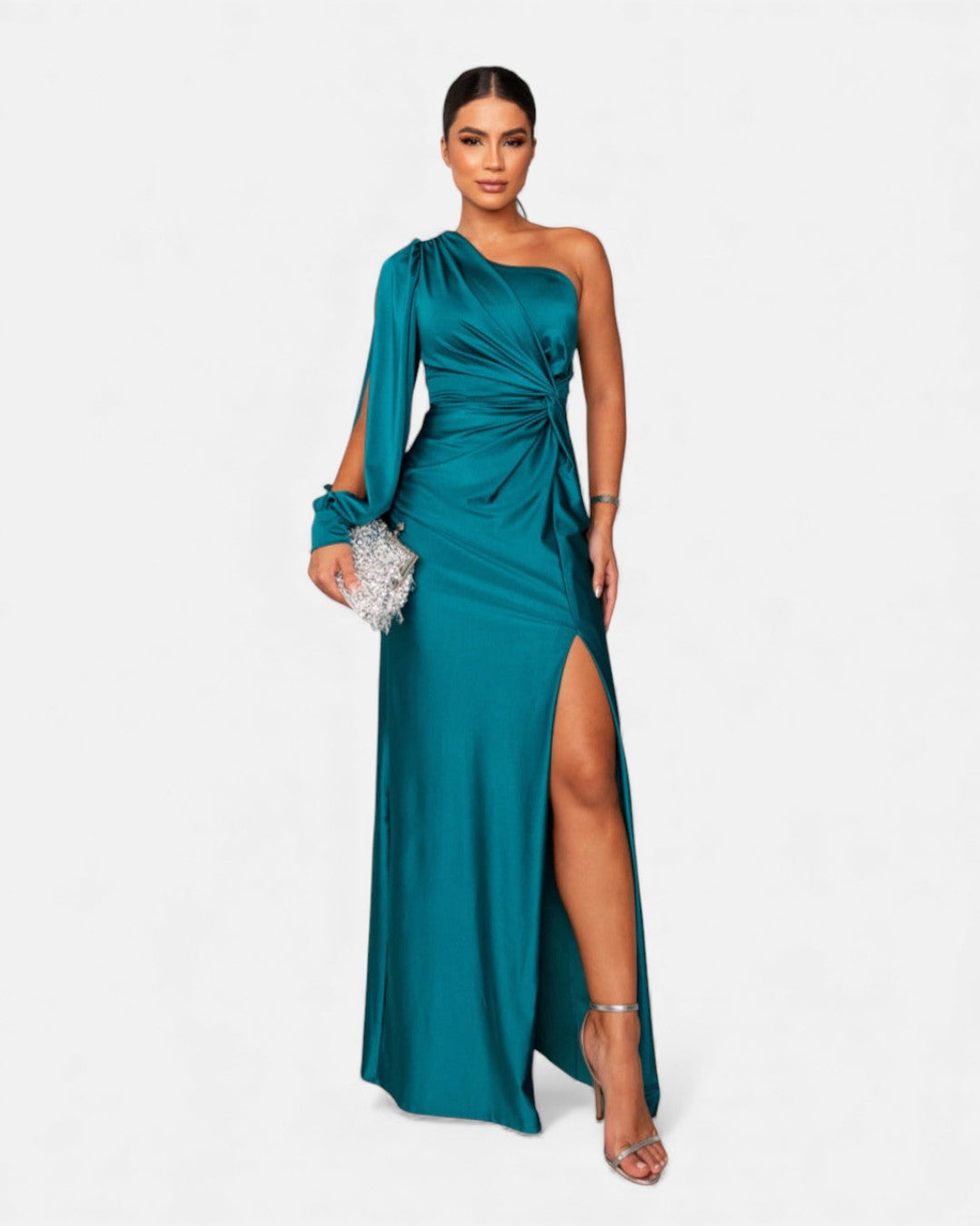 Ta elegancka, jednoramienna suknia to idealne połączenie klasy, nowoczesności i wyrafinowanego kroju. Zmysłowe drapowanie oraz wysoki rozporek nadają sylwetce lekkości i podkreślają jej naturalne kształty. Model sprawdzi się na wyjątkowe okazje, od gal po wieczorne przyjęcia, gwarantując wygląd pełen stylu i luksusu.